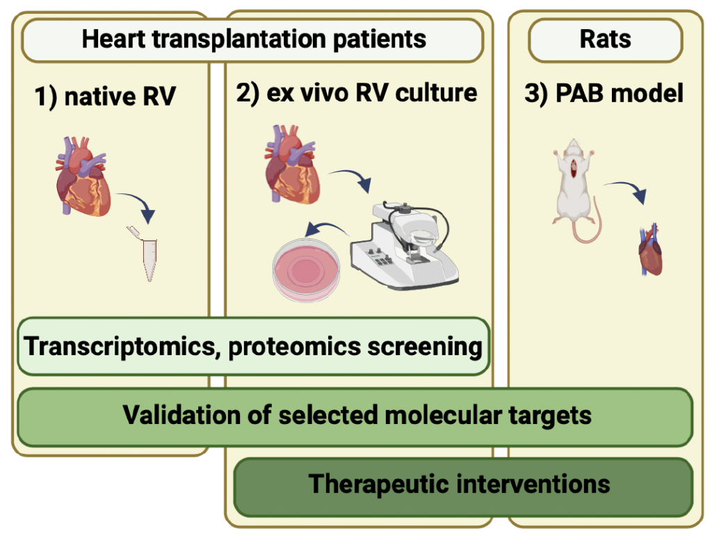Dysfunkcja prawej komory jest poważnym problemem w niewydolności serca. Jest główną przyczyną śmierci w tętniczym nadciśnieniu płucnym i znacznie pogarsza wyniki leczenia w nadciśnieniu płucnym spowodowanym chorobami lewej komory. Dysfunkcja prawej komory i nadciśnienie płucne są kluczowymi czynnikami wpływającymi na możliwości leczenia pacjentów z zaawansowaną niewydolnością serca. Projekt ma na celu identyfikację nowych molekularnych targetów dysfunkcji prawej komory przy użyciu trzech modeli: 1) natywnych tkanek prawej komory pobranych od pacjentów po przeszczepie serca i zdrowych serc kontrolnych, 2) hodowli skrawków tkanki prawej komory eksponowanych na czynniki prozapalne, prowłóknieniowe i stres mechaniczny, oraz 3) modelu szczurzym dysfunkcji prawej komory wywołaniem uciskiem tętnicy płucnej. Dla natywnych tkanek prawej komory z przeszczepionych serc, zidentyfikujemy molekularne targety związane z dysfunkcją prawej komory, ciśnieniem w tętnicy płucnej, włóknieniem tkanek, wielkością kardiomiocytów i innymi istotnymi czynnikami. W modelu ex vivo będziemy badać, jak czynniki zapalne, pro-włóknieniowe i stres mechaniczny wpływają na zmiany w tkance prawej komory, a model szczurzy pomoże nam zweryfikować molekularne szlaki wywoływane głównie przez tętnicze nadciśnienie płucne. Lepsze zrozumienie dysfunkcji prawej komory pozwoli nam na tworzenie skuteczniejszych metod leczenia i poprawę opieki nad pacjentami. Pomoże to wypełnić obecne luki w diagnostyce, prognozowaniu i leczeniu niewydolności serca.